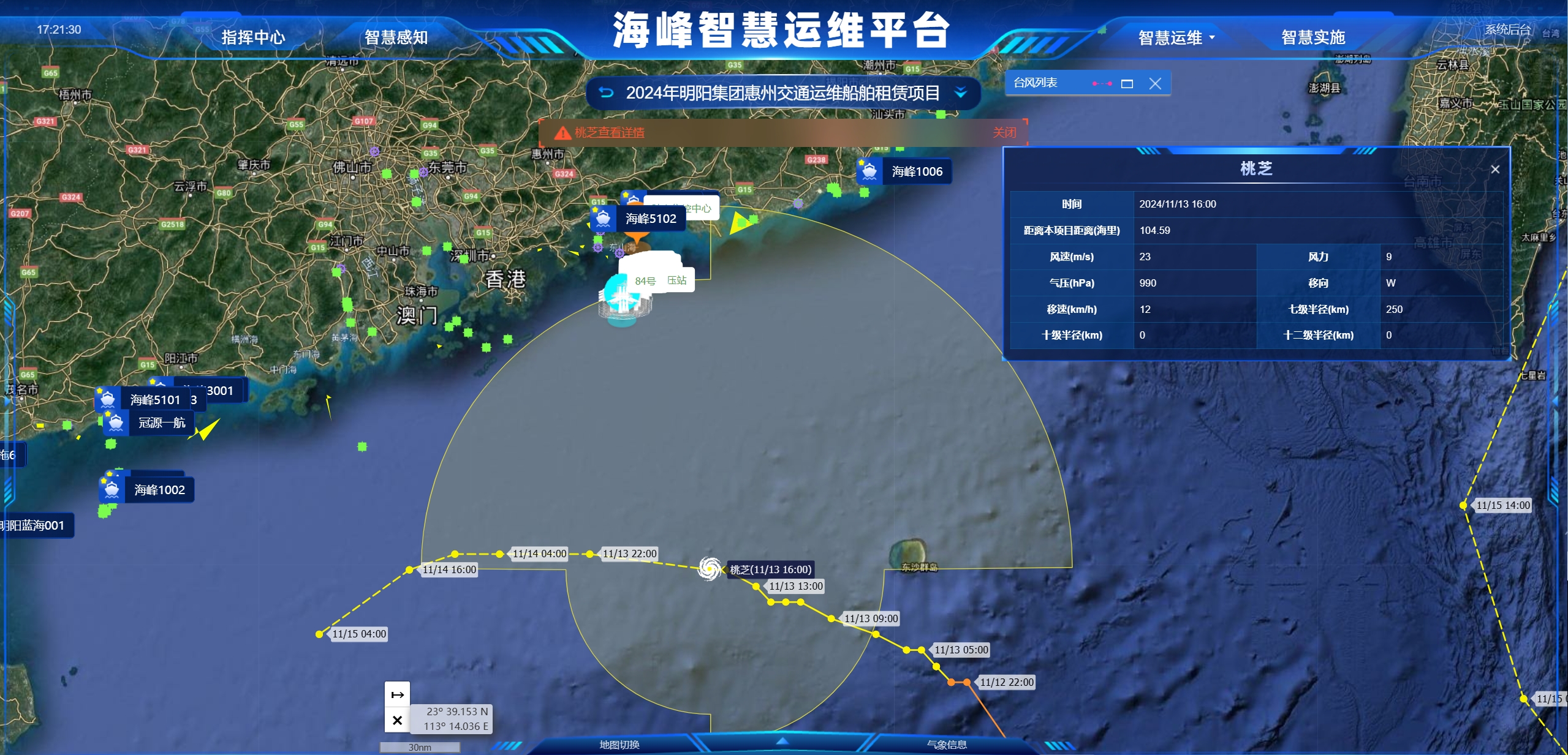 通过拟合不同气象数据源的高精度气象数据,实现任意风场区域、任意风机湿度、风速、风向、波高、波周期、波向、湿度、能见度等气象信息的7日内小时级预报,可以实现不同业务的窗口期预测,及时掌握灾害天气趋势,统筹规划运维作业。